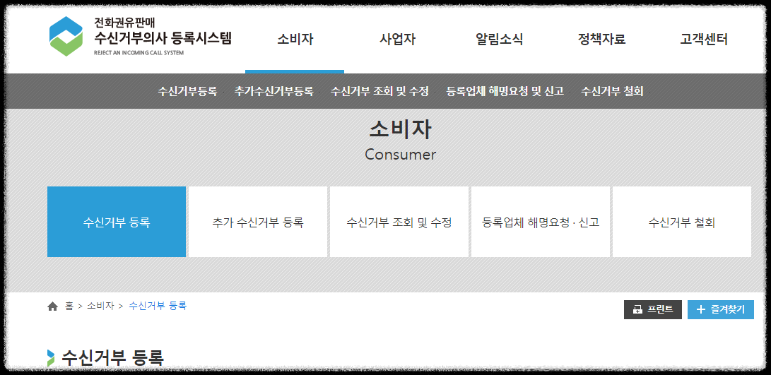 창에 들어 가시면, 소비자 위에 마우스를 올리시면, "수신거부 등록" 화면에 뜹니다.